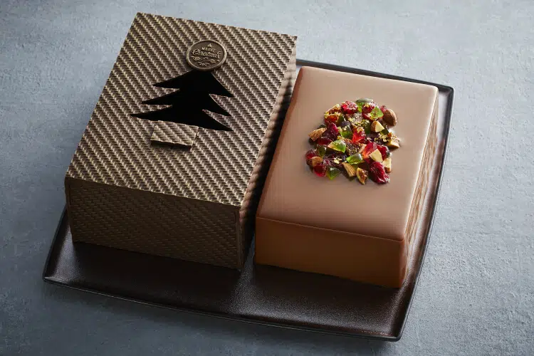 ツリーをかたどったショコラボックスの中にアプリコットのコンフィや、